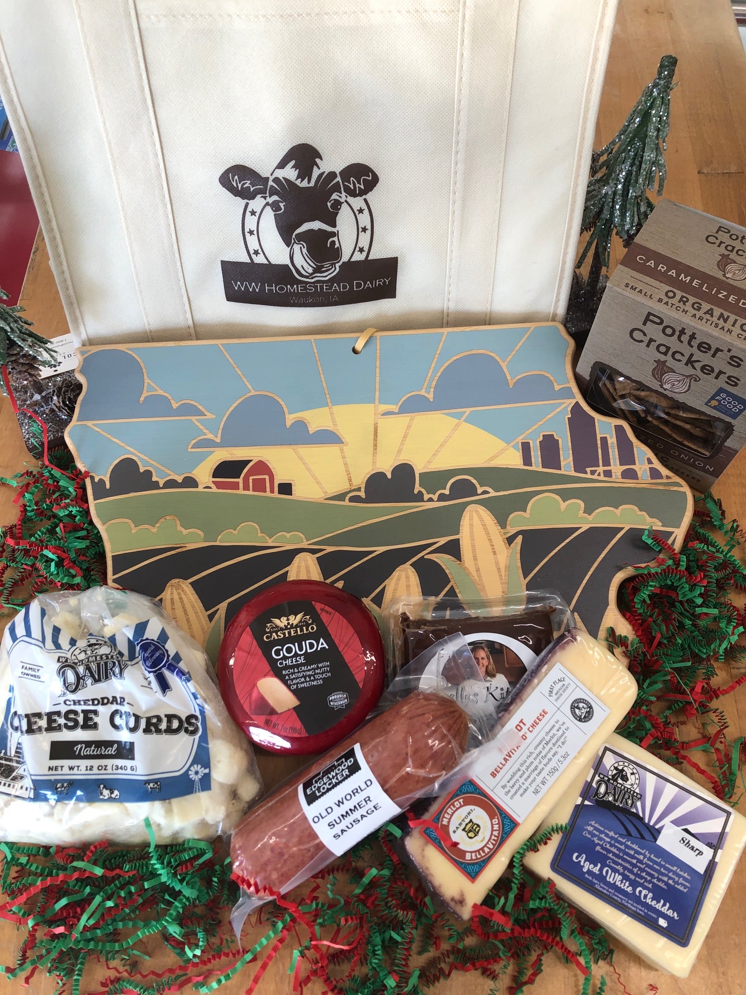 The perfect gift! Includes cutting board, 5 cheeses of your choice, 8 oz summer sausage, box of Potter's crackers and WW Homestead Dairy insulated tote.